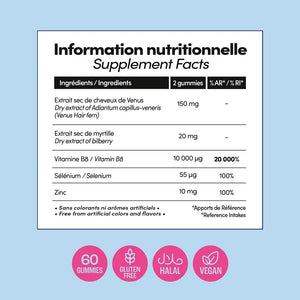 - Cheveux de Vénus & extrait de myrtille : protègent les cheveux avec des propriétés antioxydantes reconnues.